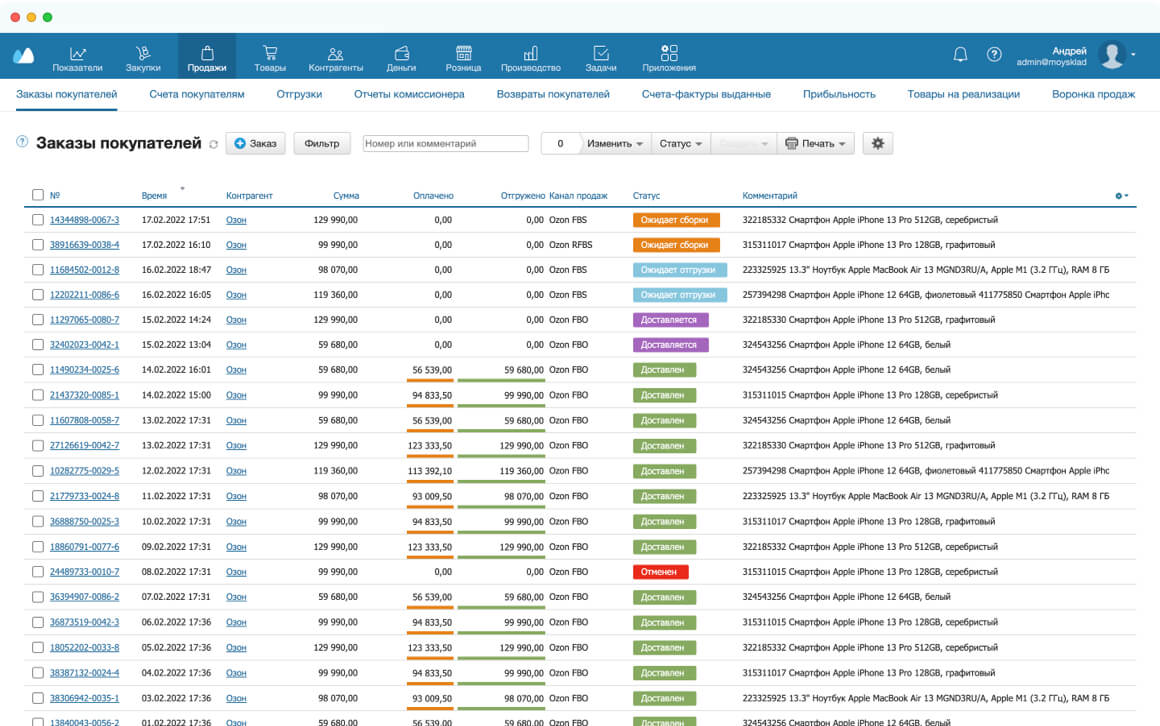 | № | Контрагент | Сумма | Оплачено | Отгружено | Со склада | Канал продаж | Статус | Адрес доставки | Комментарий |